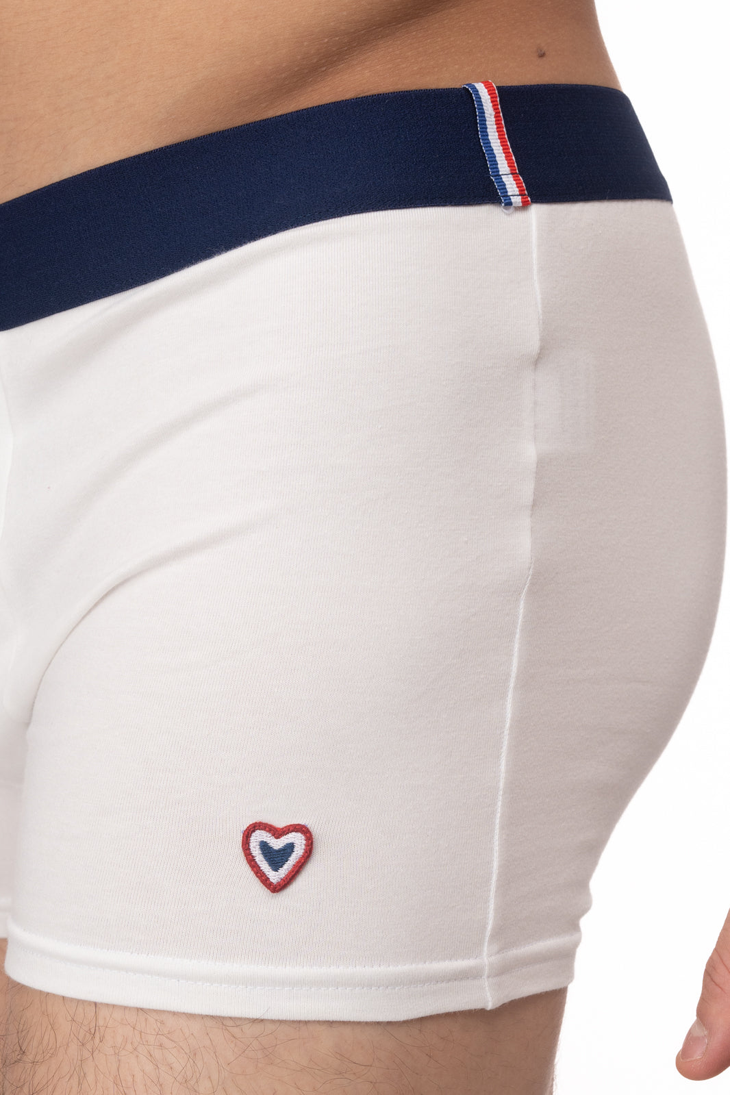 Ce caleçon noir en coton avec son élastique bleu marine de 3,5 cm sans oublier le cœur brodé bleu, blanc, rouge avec amour et sa bande tricolore.