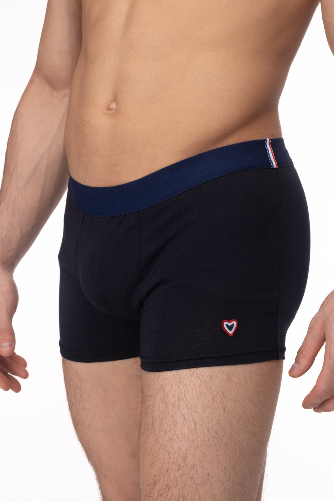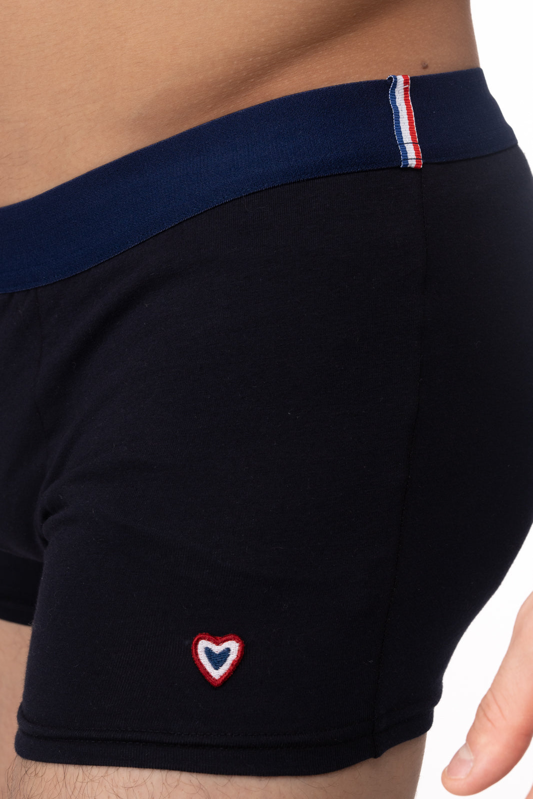 Ce caleçon marine en coton avec son élastique bleu marine de 3,5 cm sans oublier le cœur brodé bleu, blanc, rouge avec amour et sa bande tricolore.