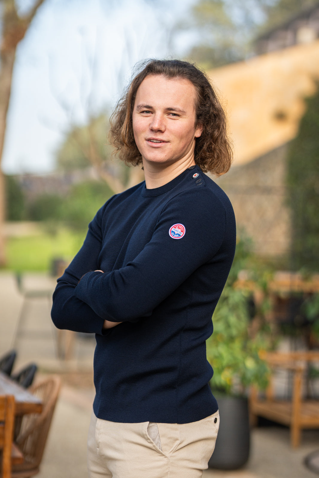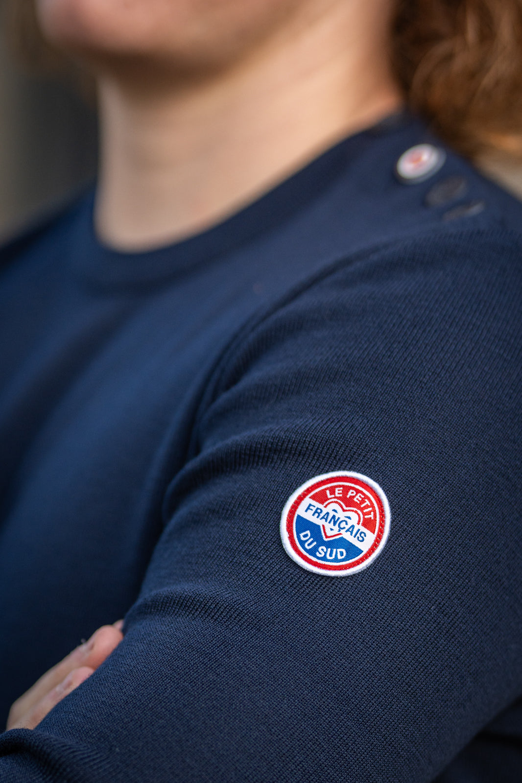 Le patch distinctif sur le bras gauche ajoute une touche de caractère, soulignant le design classique du pull marin bleu marine. Sur l'épaule gauche, un bouton tricolore symbolise l'héritage français et l'amour pour la qualité exceptionnelle.