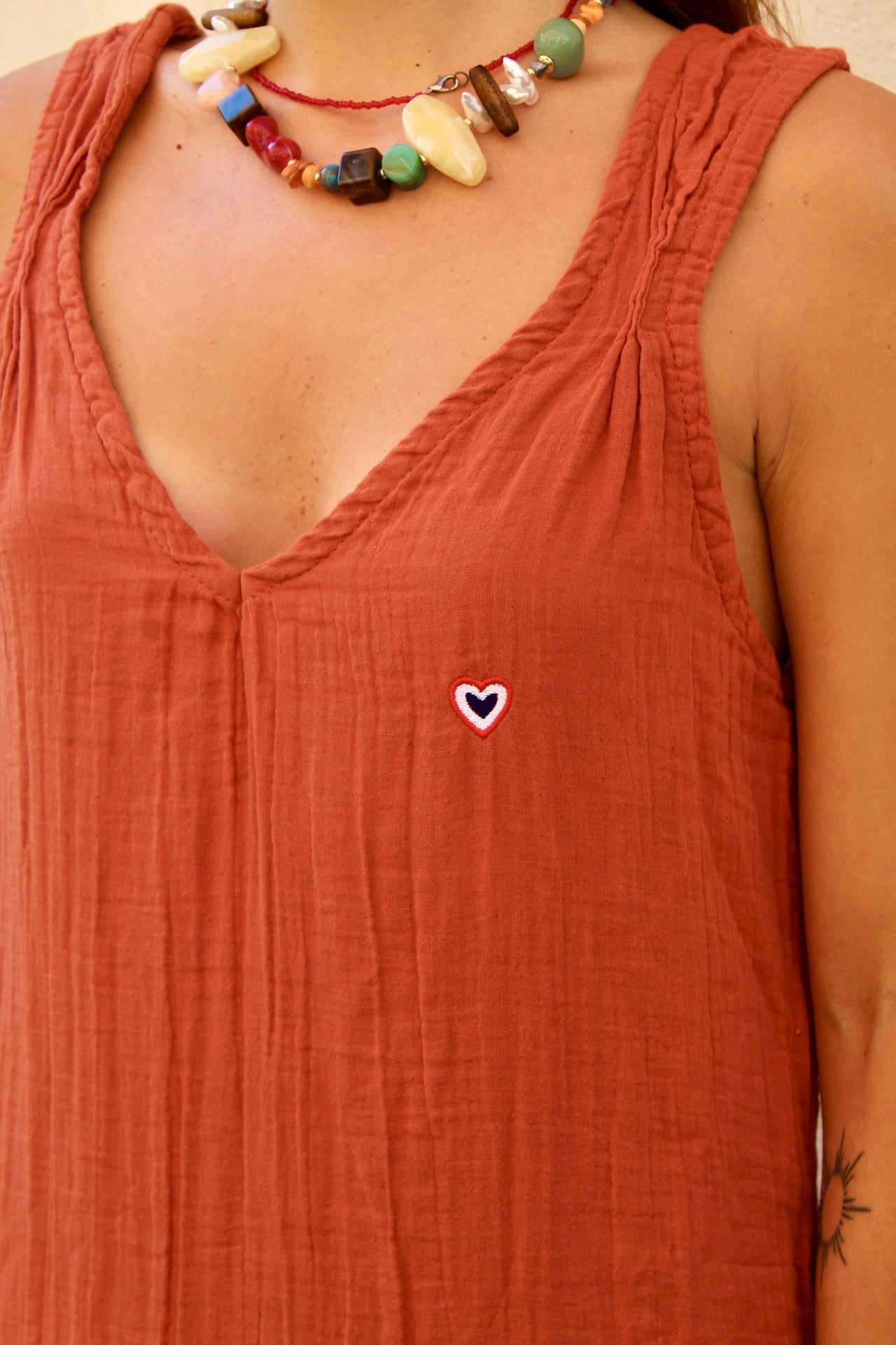 Légère et fluide, la robe bretelle terracotta en gaze de coton est l’alliée parfaite des journées ensoleillées.