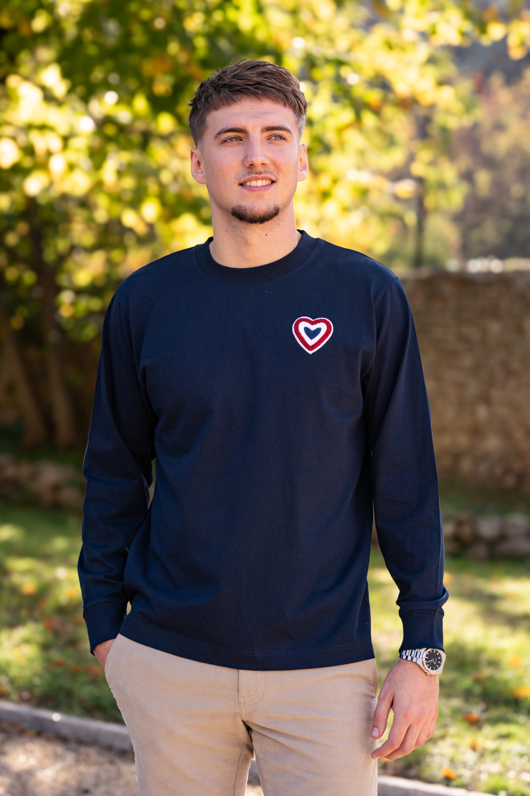 Le cœur tricolore en bouclette, brodé sur la poitrine, donne toute son identité au t-shirt bouclette marine: un détail texturé qui ne passe pas inaperçu.